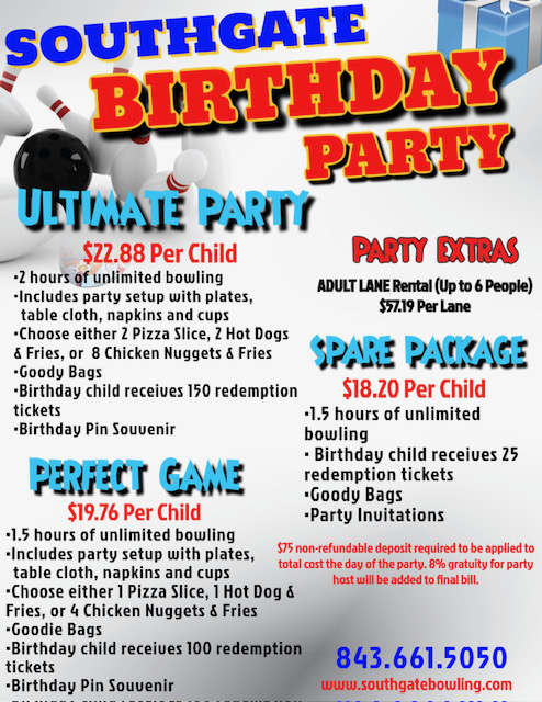* $75 non-refundable deposit required to be applied to total cost the day of the party. 8% gratuity for party host will be added to final bill.